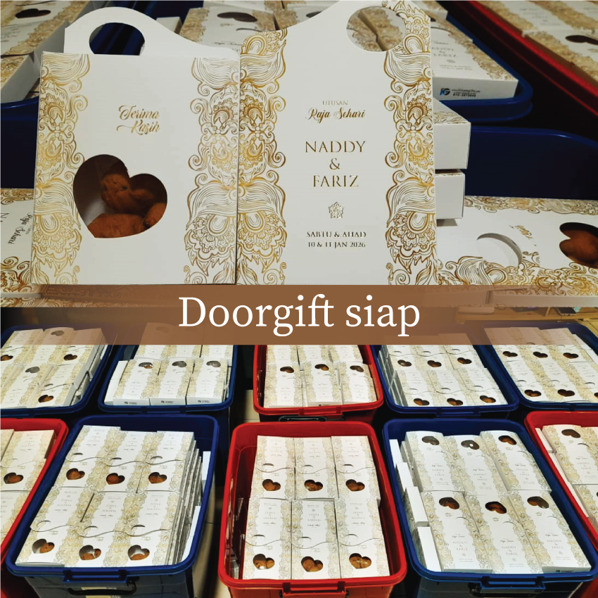 Beri kenangan manis kepada tetamu dengan doorgift kahwin dibungkus dalam kotak mewah. Setiap kotak boleh custom nama pengantin, tajuk majlis, dan tarikh majlis melalui proses hot stamping berkilau yang elegan.