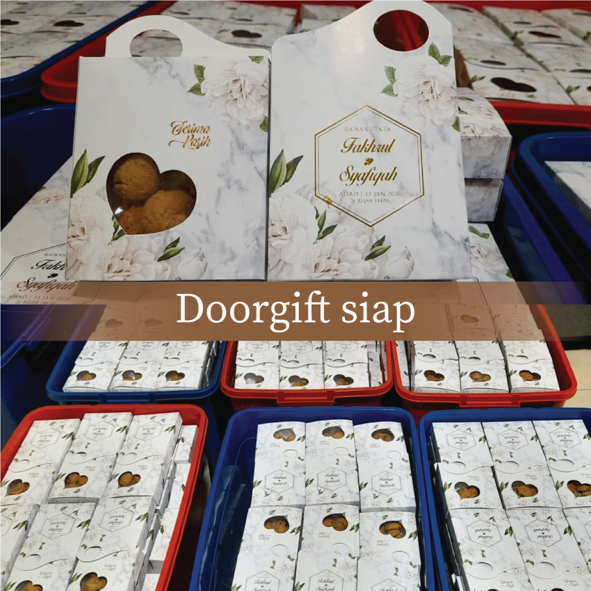 Beri kenangan manis kepada tetamu dengan doorgift kahwin dibungkus dalam kotak mewah. Setiap kotak boleh custom nama pengantin, tajuk majlis, dan tarikh majlis melalui proses hot stamping berkilau yang elegan.