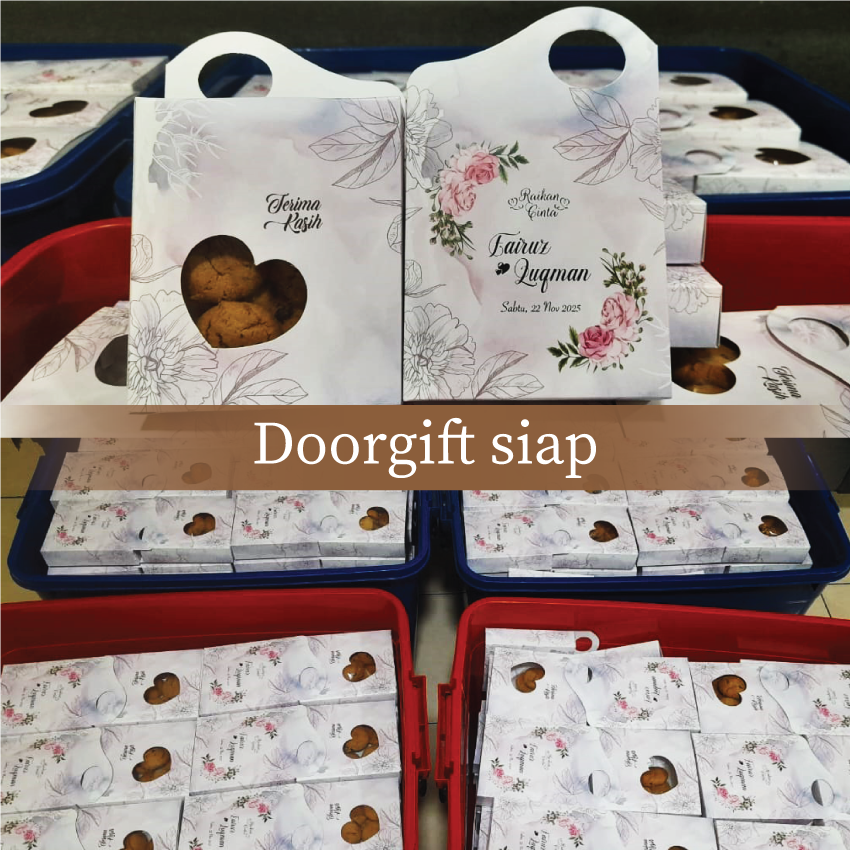 Beri kenangan manis kepada tetamu dengan doorgift kahwin dibungkus dalam kotak mewah. Setiap kotak boleh custom nama pengantin, tajuk majlis, dan tarikh majlis melalui proses hot stamping berkilau yang elegan.